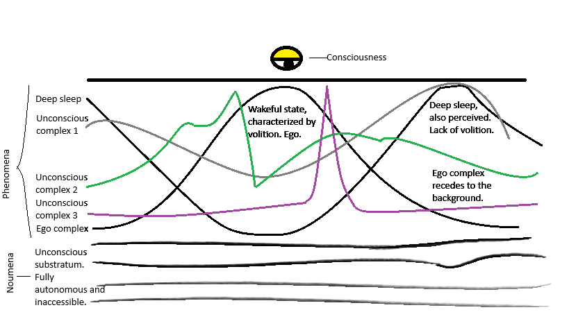 In the image above, for example, complex No. 1 could be something like sexual desire that has undergone repression during wakefulness but comes back at night to prevent or disrupt deep sleep. Instead of deep sleep, the dreamer gets sub-optimal sleep and a dream full of complex impressions around the topic of sexuality. Complex No. 2 could be something like a strong emotion after receiving some bad news that the ego pushes down in order to operate in society, though this complex remains underneath, semi-conscious, coloring the experience of the whole day. Lastly, complex No. 3 could be like a quick reflex that goes away as soon as it came. It could also be a fit of anger that needs to be repressed immediately.