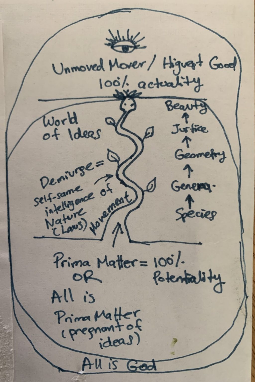 The Unmoved Mover/Highest Good is the most actual of all ideas, the ultimate finality that is ever existent, unchanged. This “Self” (as named by the yogis in India) is also attribute-less, uncaused, all-encompassing, not-this nor-that, does not exert itself for it does not desire anything; in turn, it is the desired thing. This is none other than consciousness!