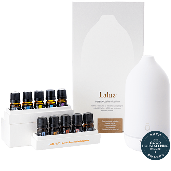 The Aroma Essentials Collection includes the Laluz® Diffuser and 5 mL bottles of each of the following products: